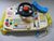 Beschreibung: Auto-Lenkrad mit Blinkerhebel, 5 verschiedene Huptöne, Gangschaltung, Zündschlüssel, Telefon, ABC-Tastatur, Dreieck-, Kreis-, Stern- und Vierecktaste, Autoradio mit 9 Kinderliedern.