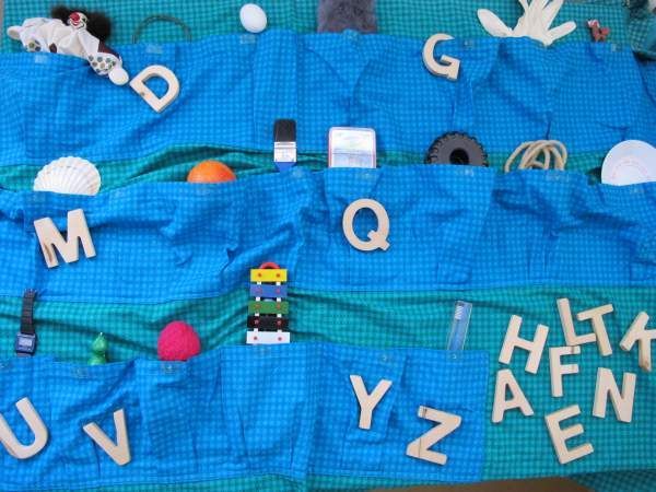 Beschreibung: Stoff-Wandbehang mit 26 Taschen, 26 Buchstaben, 26 verschiedenen Gegenständen.