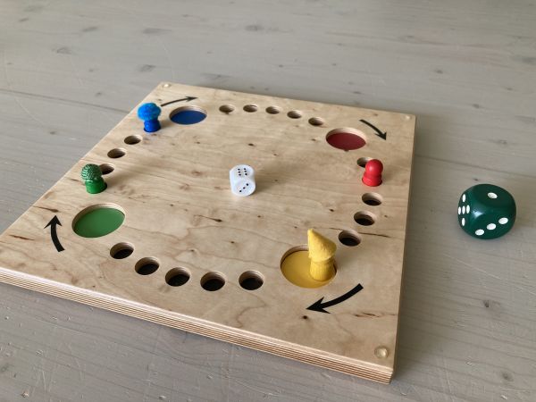 Beschreibung: beidseitig bespielbare Holzplatte mit vertieften Feldern, 4 Spielfiguren, 2 taktile Würfel