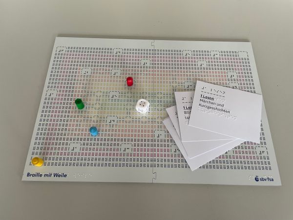 Beschreibung: Magnetisches Spielbrett mit taktiler Oberfläche aus Braillepunkten, 4 Spielfiguren, 30 Karten in Braille und Schwarzschrift, 1 taktiler Würfel