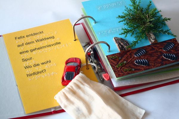 Beschreibung: Buch in Ringordner, Illustrationen mit verschiedenen Materialien, Braillevollschrift