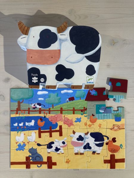 Beschreibung: 42 x 30 cm grosses Puzzle aus 24 Teilen, Kuhförmige Schachtel