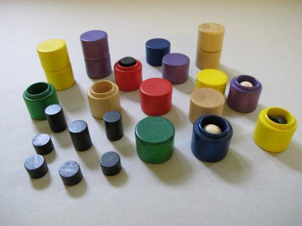 Beschreibung: 60 Versteckhölzchen in 6 Farben, je 30 Ober- und Unterteile, 20 Poltergeister in 2 Grössen, 2 Kugeln (Kellerasseln) aus Holz.