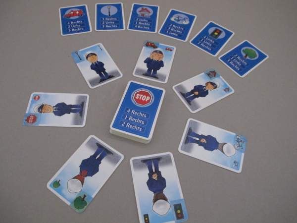 Aufgabe/Ziel: Sieben Karten liegen, kreisförmig angeordnet, offen auf dem Tisch. Auf jeder Karte ist ein Verkehrspolizist zu sehen. Entweder sieht man den Polizist von vorne oder von hinten. Im Spielverlauf müssen (von einem Polizist ausgehend) drei Bewegungen nacheinander ausgeführt werden - mal geht's links herum, mal nach rechts. Die Schwierigkeit hierbei besteht darin, dass man wissen muss, wo denn nun links ist und wo rechts. Nach "links" heisst nämlich immer: vom Polizist aus gesehen nach links und umgekehrt! Die Spieler müssen möglichst schnell herausfinden, bei welcher Karte man nach den drei Bewegungen landet.