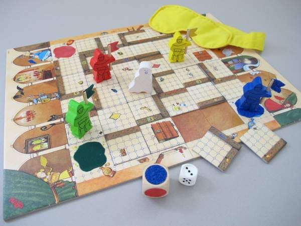 Beschreibung: 4 Ritter, 1 Gespenst (Gunilla), 1 Spielplan, 32 Labyrinth-Karten, 1 Augenbinde, 1 Farbwürfel, 1 Augenwürfel, 1 Spielanleitung.