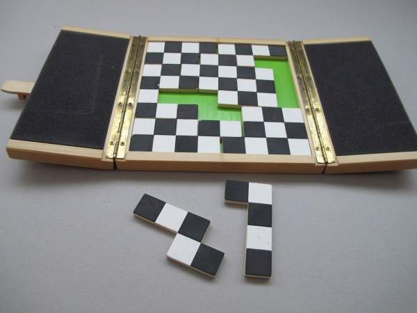 Beschreibung: Schachbrett (Holz) mit 12 Teilen schwarz-weiss, tastbar.