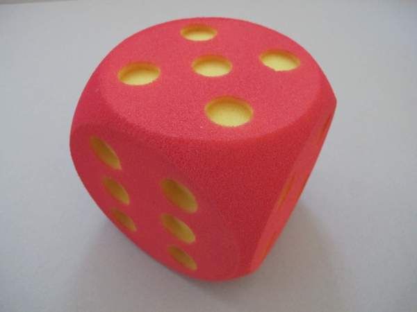 Beschreibung: Schaumstoff-Würfel, Seitenmass: 15 cm, mit vertieften Punkten.