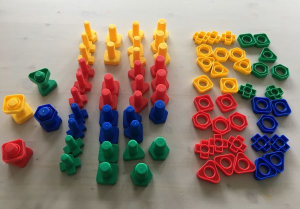 Beschreibung: Grosse Plastikschrauben in 4 verschiedenen Farben und Formen, Ø des 6-Eck Schraubenkopfs 5 cm x Höhe 6 cm, total 80 teilig, mit 32 farbigen Vorlagen Kärtchen
