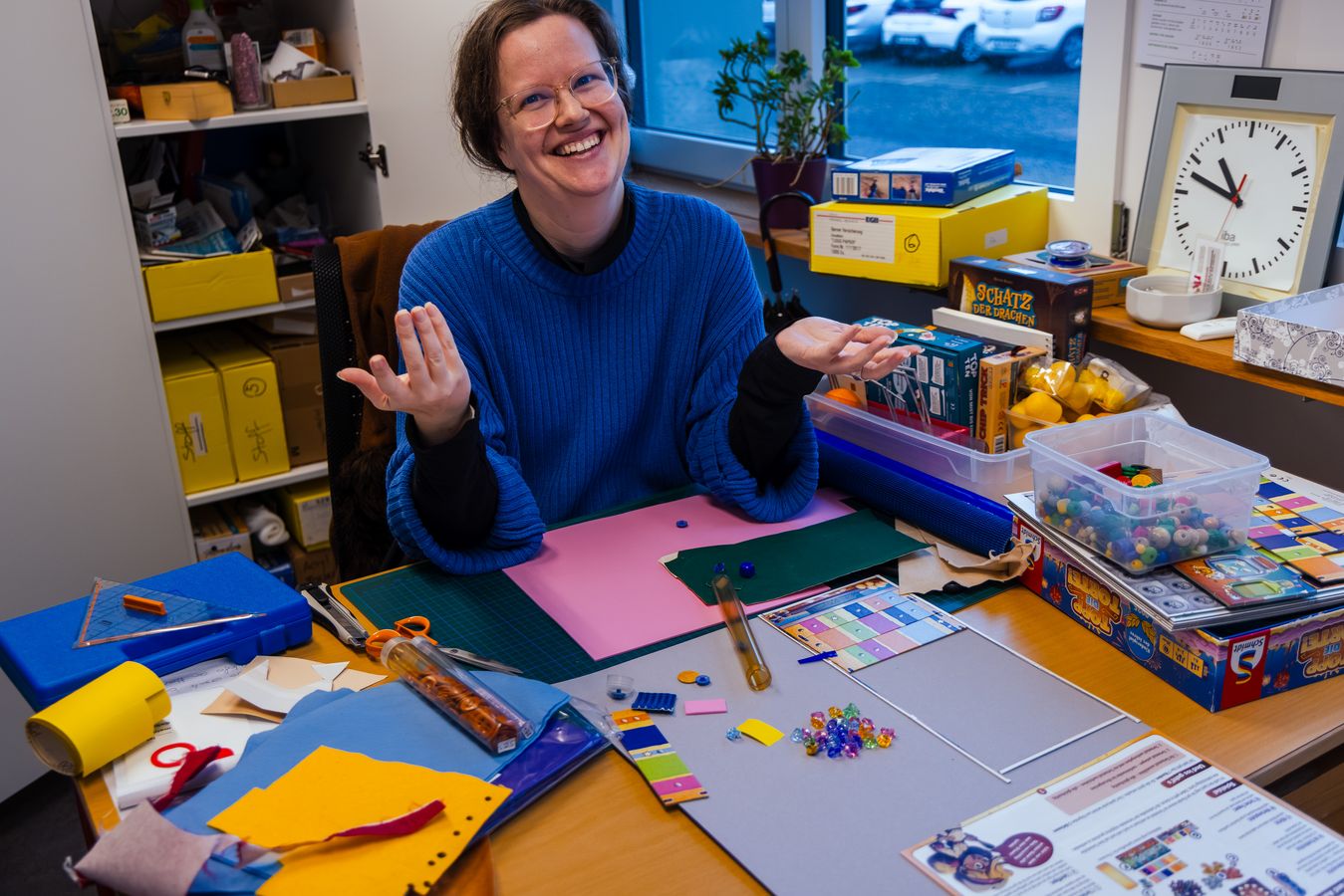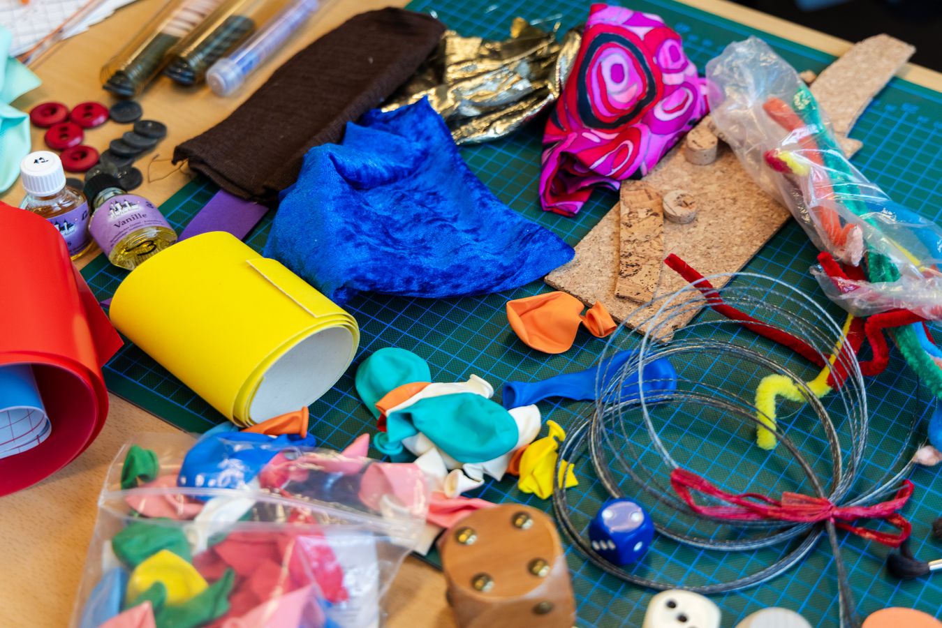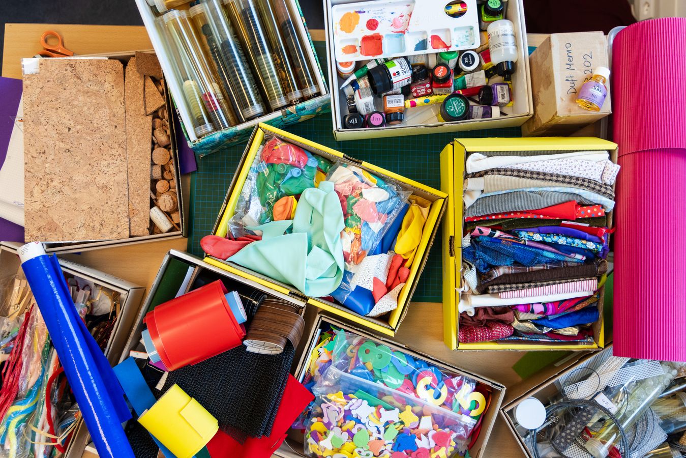 LudothekAuf dem Arbeitstisch türmen sich Filzreste, Plastikfolien, Prototypen. Kartonrollen, jede mit eigener Textur. In transparenten Boxen lagern Holzperlen, eckig, gerillt, kugelrund. Knöpfe, gross, klein, irgendwas dazwischen; mit einem, zwei oder auch vier Löchern.
