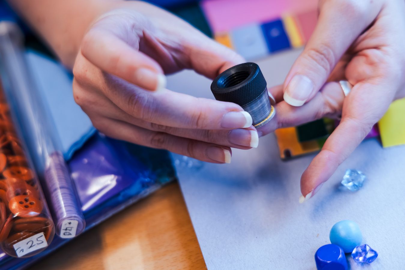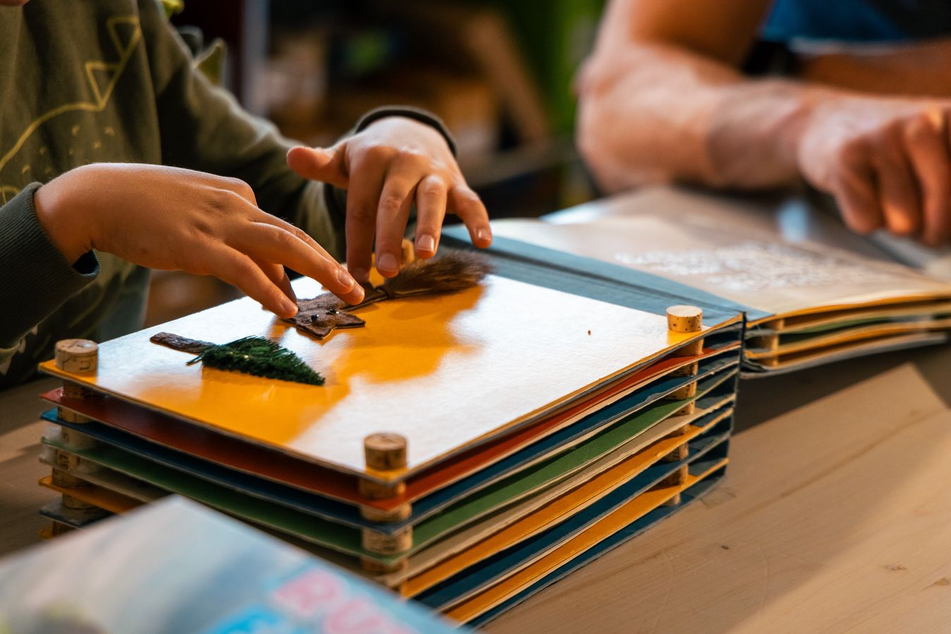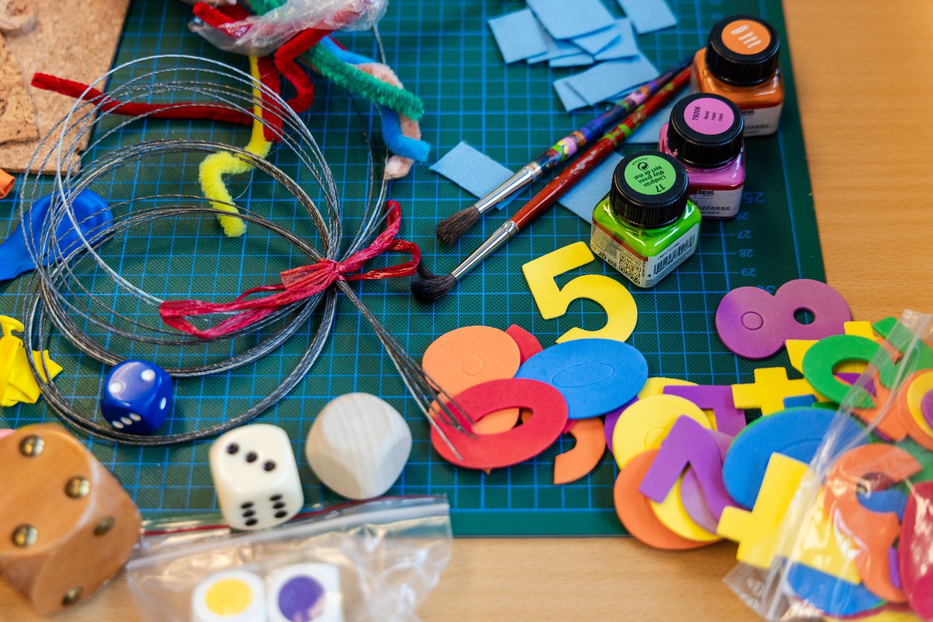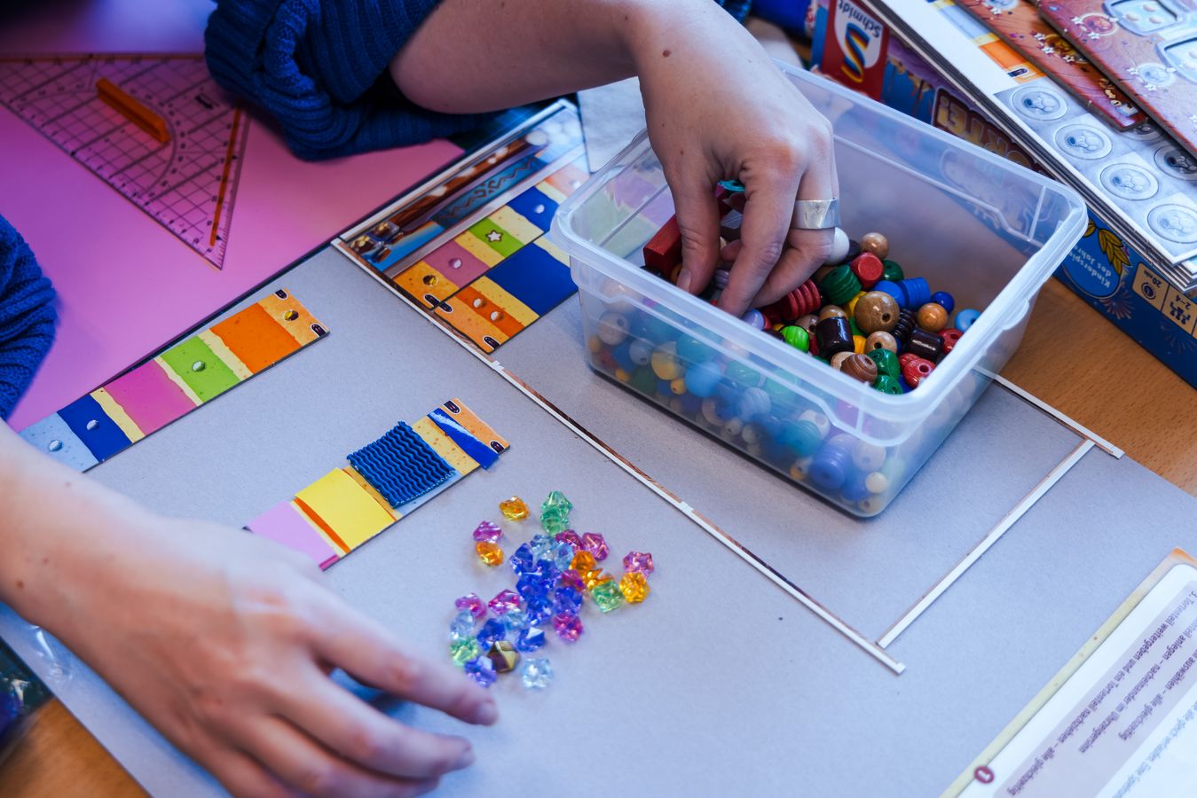 LudothekAuf dem Arbeitstisch türmen sich Filzreste, Plastikfolien, Prototypen. Kartonrollen, jede mit eigener Textur. In transparenten Boxen lagern Holzperlen, eckig, gerillt, kugelrund. Knöpfe, gross, klein, irgendwas dazwischen; mit einem, zwei oder auch vier Löchern.