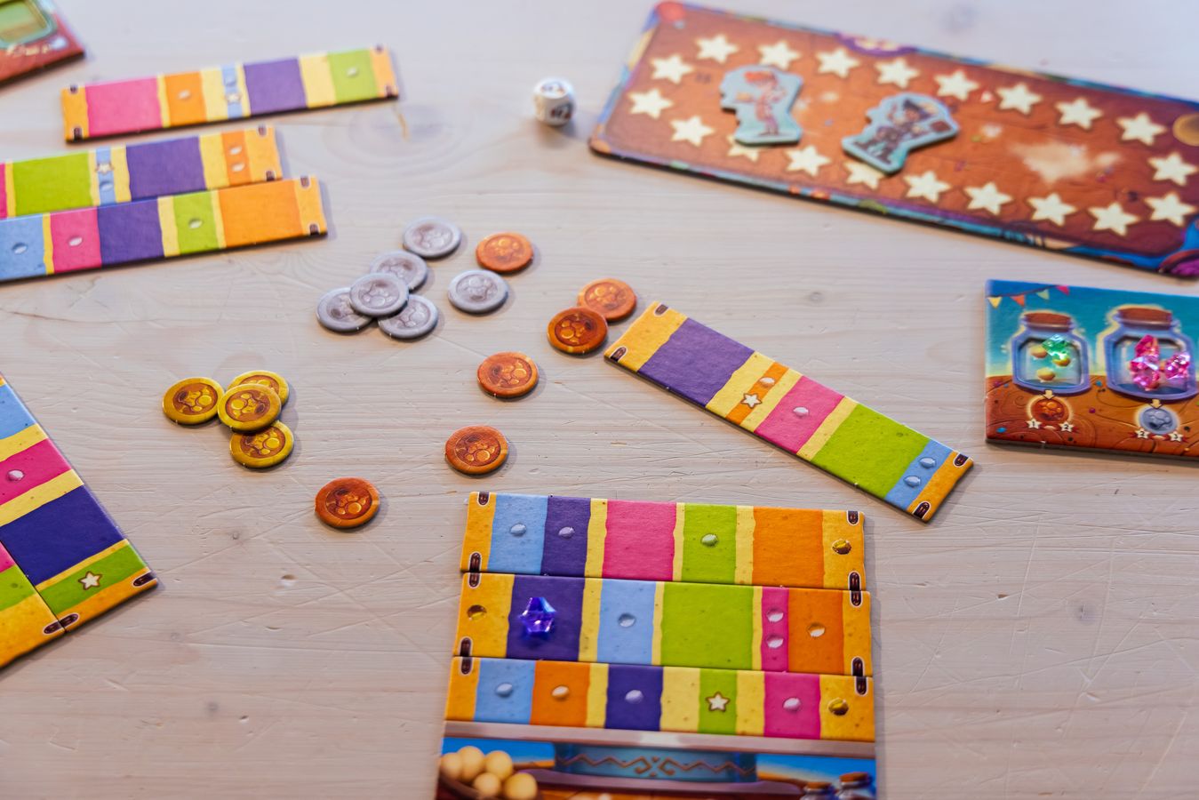 Im Kopf entstehen die ersten Ideen zur Anpassung. Die Farben der Torte werden taktil umgesetzt. Die farbigen und goldenen Plastikperlen, die Zuckerwürfel im Spiel, sind zwar hübsch anzusehen, doch für Menschen, die ihren Tastsinn nutzen, nicht zu unterscheiden. «Viele Anpassungen ergeben sich während der Umsetzung, während ich Material teste und wieder verwerfe.» Sophie Wilmsmeier entscheidet sich für Plastikplättchen, die sie mit dem gleichen Material beklebt wie die Tortenstücke. 14 mm klein. Als sie die Kreise mit einem Locheisen und Hammer stanzt, schaut manch eine Kollegin, ein Kollege kurz verwundert über den Lärm zu ihr ins Büro.