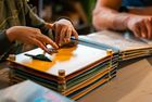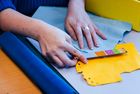 Mit dem Japanmesser schneidet Sophie Wilmsmeier kleinste Rechtecke aus hellblauem Filz, blauer Folie, gelb leuchtendem Schleifpapier. Prüfend legt sie sie auf einen Kartonstreifen aus ihrem aktuellen Projekt Topp die Torte, Kinderspiel des Jahres 2025. Die länglichen Streifen sind das Herzstück des Spiels, die Torte sozusagen, jedes Tortenstück dekoriert mit farbigen Streifen.