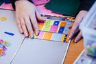In den Schränken und auf den Ablagen stapeln sich Sortierboxen, gefüllt mit Magneten, Stoff, Klett, Kork, Holz, Würfeln in verschiedenen Grössen und Formen. Ja, da finden sich sogar Materialien, die den Duftsinn fordern: Döschen mit Honig, Apfel, Vanille, Tannennadeln, Flieder. Auf kleinstem Raum Arbeitsmaterial in Hülle und Fülle. Material zum Tasten und Riechen. Und das entsprechende Werkzeug dazu.