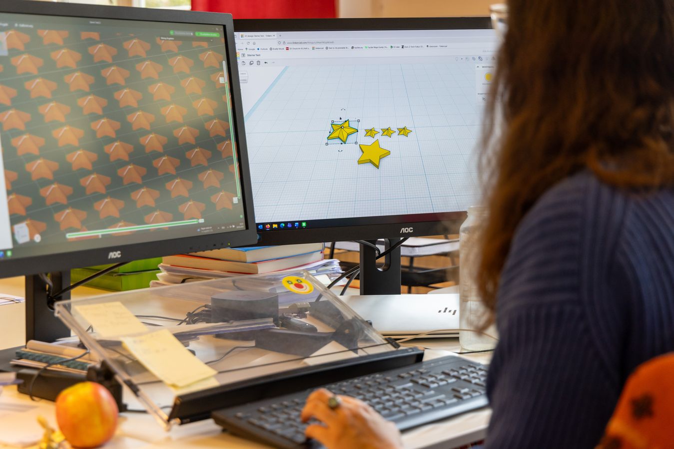 Die Zuckerwürfel, die auf den Tortenstreifen abgebildet sind, macht sie mit Klebpunkten tastbar. Doch weil sie nur durchsichtige in ihrem Fundus fand, malte Sophie Wilmsmeier kurzerhand die Unterseite weiss an. Die Sterne? Da 8 mm grosse Sterne im Handel nur mit viel Aufwand zu finden sind, druckt sie Sophie Wilmsmeier selbst. Der 3-D-Drucker ist das neuste Werkzeug in ihrem Atelier. Gedruckt wird auch der Rahmen, in dem die Tortenstreifen während des Spiels fixiert sind.